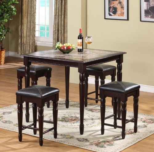 5pc Cherry Finish Wood Counter Height Faux Marble Dining Table & 4 Vinyl Cover Stools. Dimensions: Table: 39" x 39" x 36"H, Chair: 14" x 14" x 24" H. Simple assembly required.
